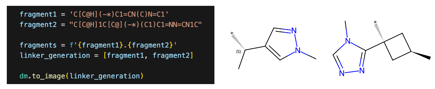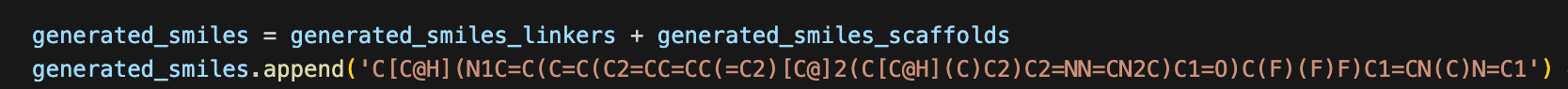 Next, the SMILES of fragments to connect the scaffolds are provided by removing the central scaffold and adding ‘*’ at the attachment points. You can add your own fragments at this stage if you decide to work on your own project rather than a hypothetical task here. SAFE’s two different methods, scaffold morphing and linker generation, are used to generate 1,000 compounds from each method, then the generated SMILES are combined.