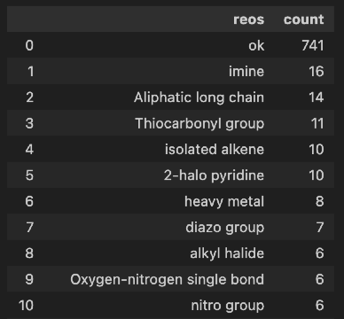 Next, I remove duplicates, which eliminates more than half of the compounds. After that, physicochemical filters as well as ‘Dundee’ substructure filters are applied using Patrick Walters' useful_rdkit_utils package. Interestingly, most of the compounds pass the Dundee filters, which is already better than many other open-source generative chemistry alternatives.