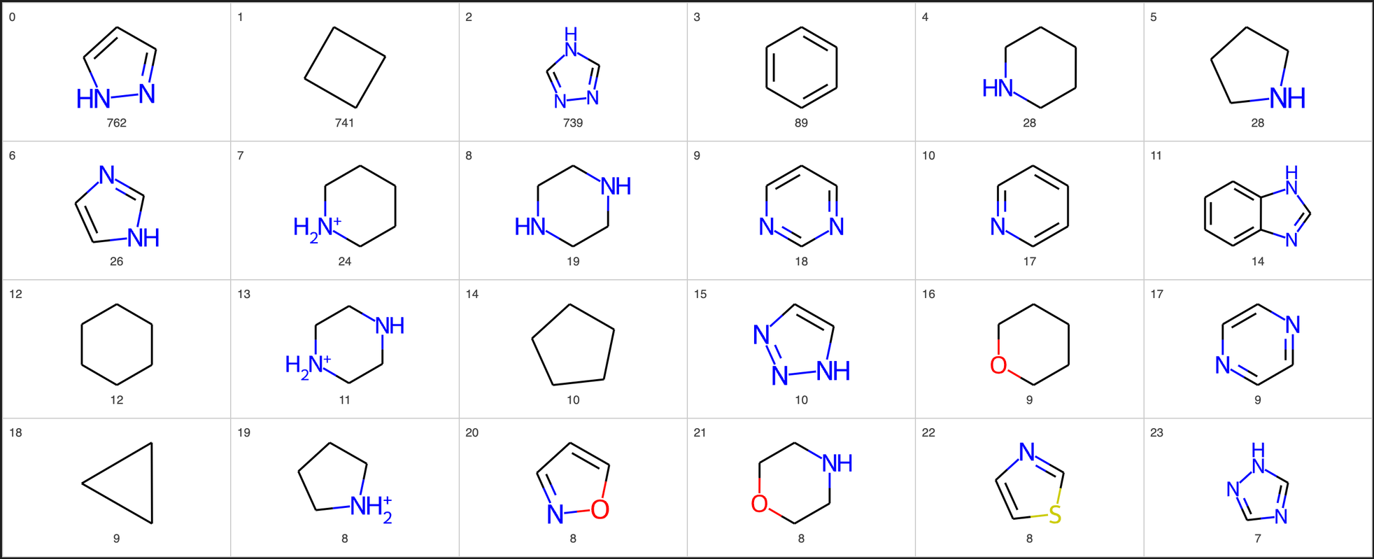 Then, I examine the rings found in the generated compounds again using Patrick Walters' useful_rdkit_utils package. I was pleasantly surprised to see that most of these ring systems look quite promising (ignore the first 3 rings as they are present in our fragments). With my synthetic medicinal chemistry background, I can tell, even without using complicated scores, that these rings are much better than those produced by several other open-source methods I have seen. Of course, you will find some odd ones if you scroll down the list, but in general, the list looks good to my synthetic chemistry eye.