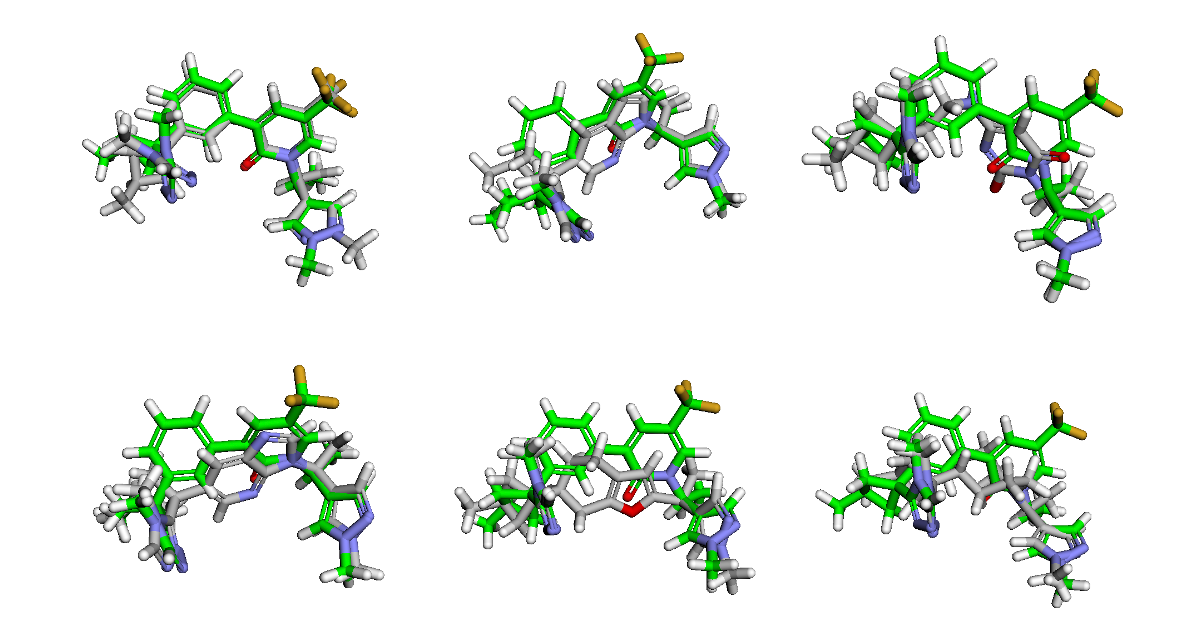 Despite these caveats, our method has been effective in identifying the top hit. Recall that we included the SMILES of compound 31 in our generated SMILES list as a test. The compound has survived the filters and is the top-scoring hit, as expected. Here are the top 6 hits with overlays on top of the original compound 31 (green).