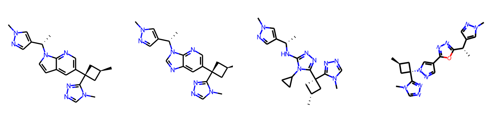 After quickly reviewing the top 20 hits, here are some of my favourites. With some tweaks to these scaffolds, such as adding the extra CF3 group that compound 31 has, some of these might work well. And, you can rerun the workflow to generate more ideas and combine the ones you like at the end.